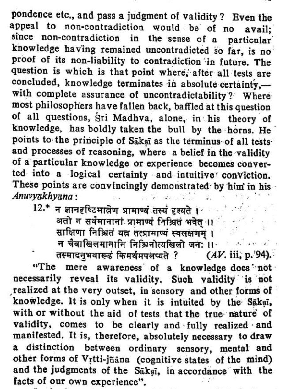 Madhva doesn’t like seeing people become nihilistic. Madhva says - reality is real. Things are separate, and our aim is to understand independent reality - Svatantara (Ishvara). The Sakshi is a person’s intuitive base observer of reality. In understanding the world, we perceive things, we see arguments, we have “mind-stuff” try to make understanding of what we see. However, no matter how much this mind stuff tries to understand something, we don’t truly understand it until it hits the Sakshi, and we get that intuitive understanding - this is what we call reality. Interesting question here of Temporal limits - what about when we think we intuitively understand something but don’t actually? The answer is that everything is timestamped - things are real as they are experienced, there’s nothing more we can say about absolute reality. If Advaitins say that something didn’t really happen, or that it was just maya, then what about the act of understanding Brahman? How do we know that that’s not false? We can only accept them both as real, and separate, other positions need additional steps.